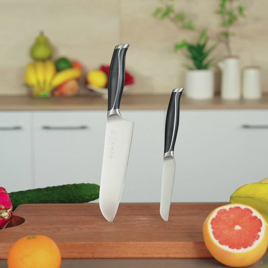 - Professional Knife Set - This kitchen knife set includes 2 razor-sharp knives: a chef knife and a fruit knife.Whether you're slicing meat,vegetables,dicing herbs,or prepping fruits, each kitchen knife of this set is designed to handle a variety of tasks effortlessly. Perfect for both professional chefs and home cooking enthusiasts.
