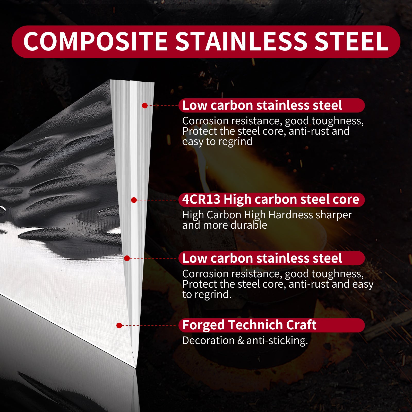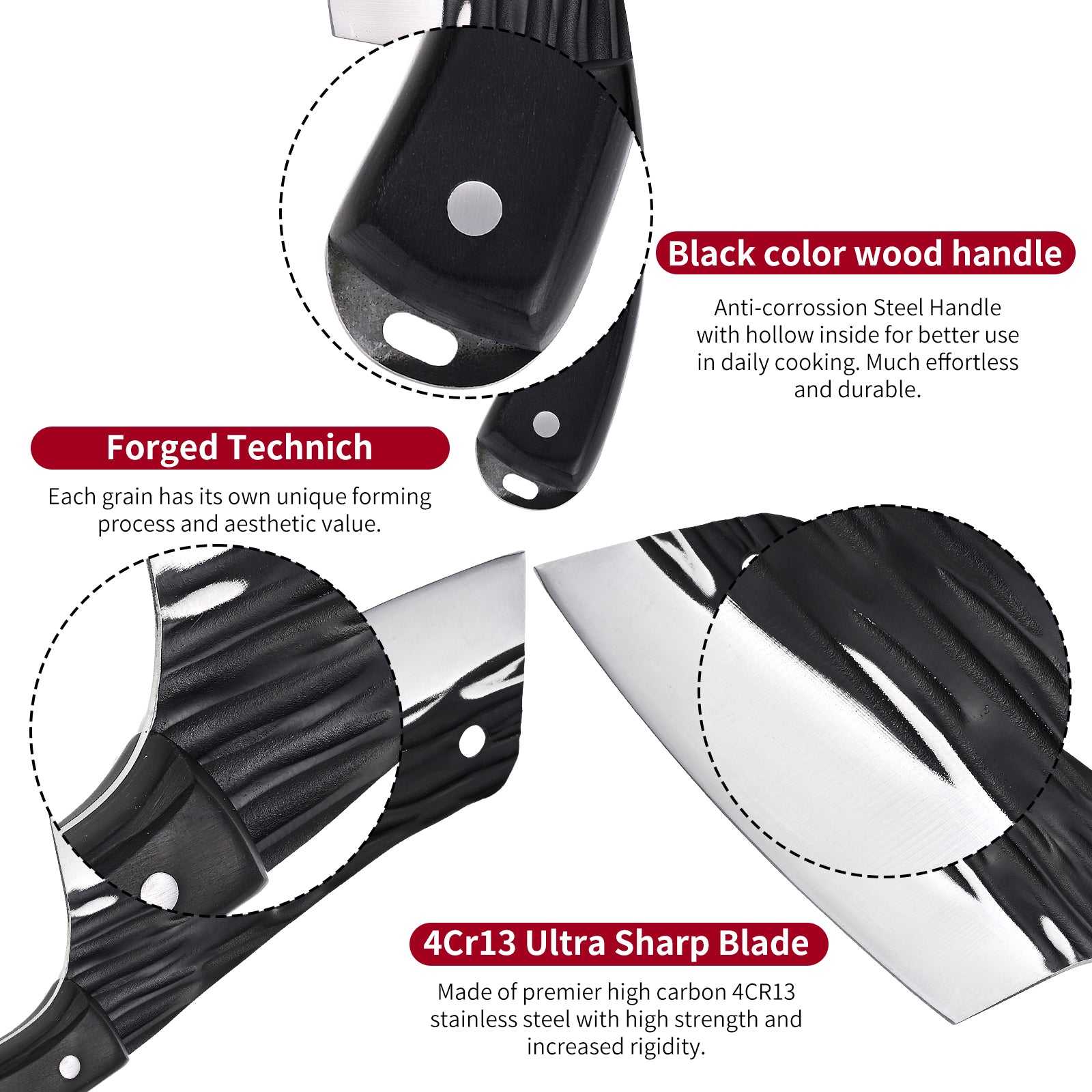 - 【Precise Craftsmanship】These forged chef knives are hand forged by craftsmen with more than 50 years of experience. Our durable knife boasts incredibly sharp blades. The chopping knife can be keeped the blade sharp for a long time, helping you cut food effortlessly. The oxidation blackening and hammering process add an anti-stick effect, enhancing the knife's technical and aesthetic appeal.