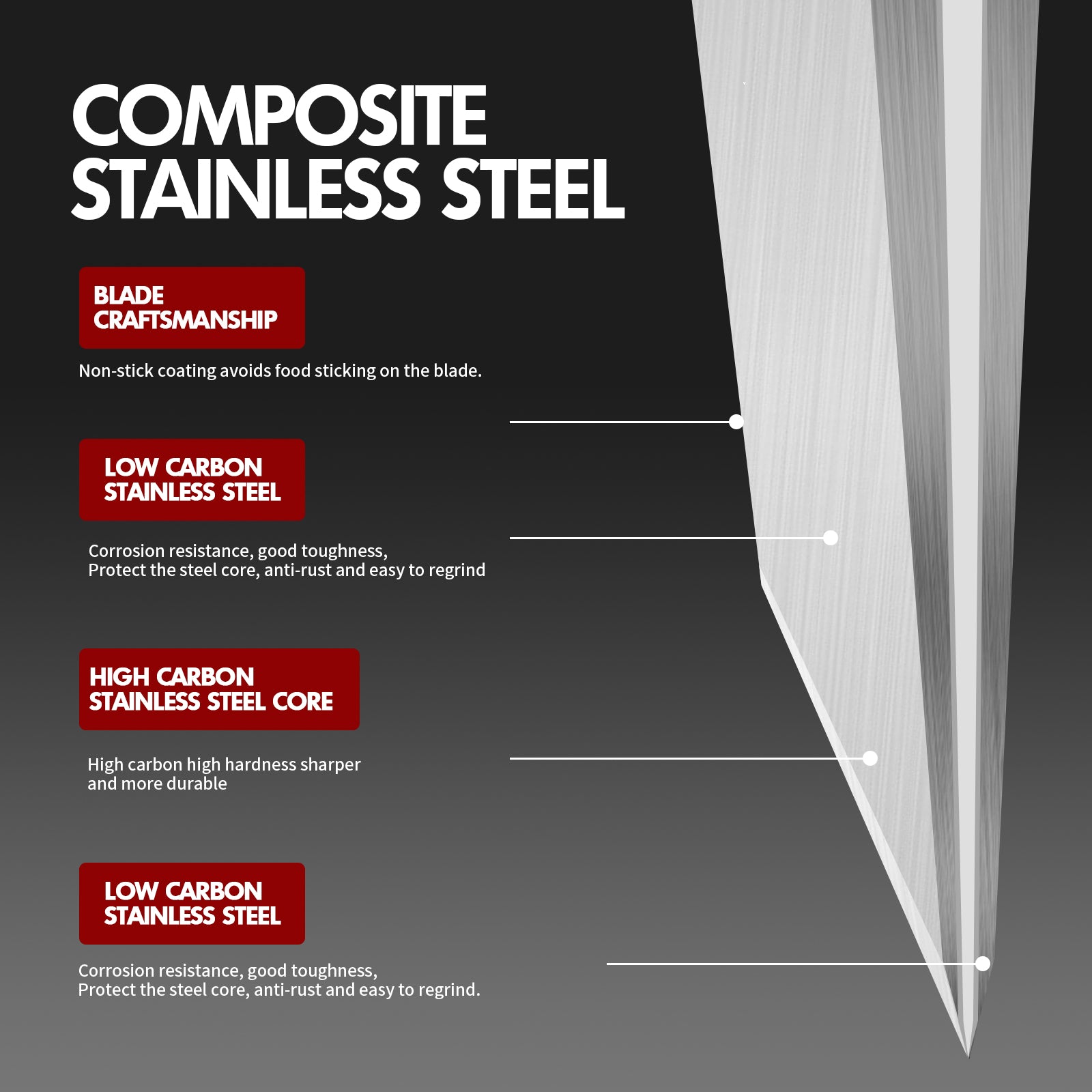- 【Premium Stainless steel】3 layer high quality clad 40Cr13 stainless steel of high carbon core steel performs excellent hardness, durability and sharpness maintaining. Outside layers of low carbon steel does well in toughness, corrosion resistance and plasticity. The combination of two steels makes this Knife perfectly work.