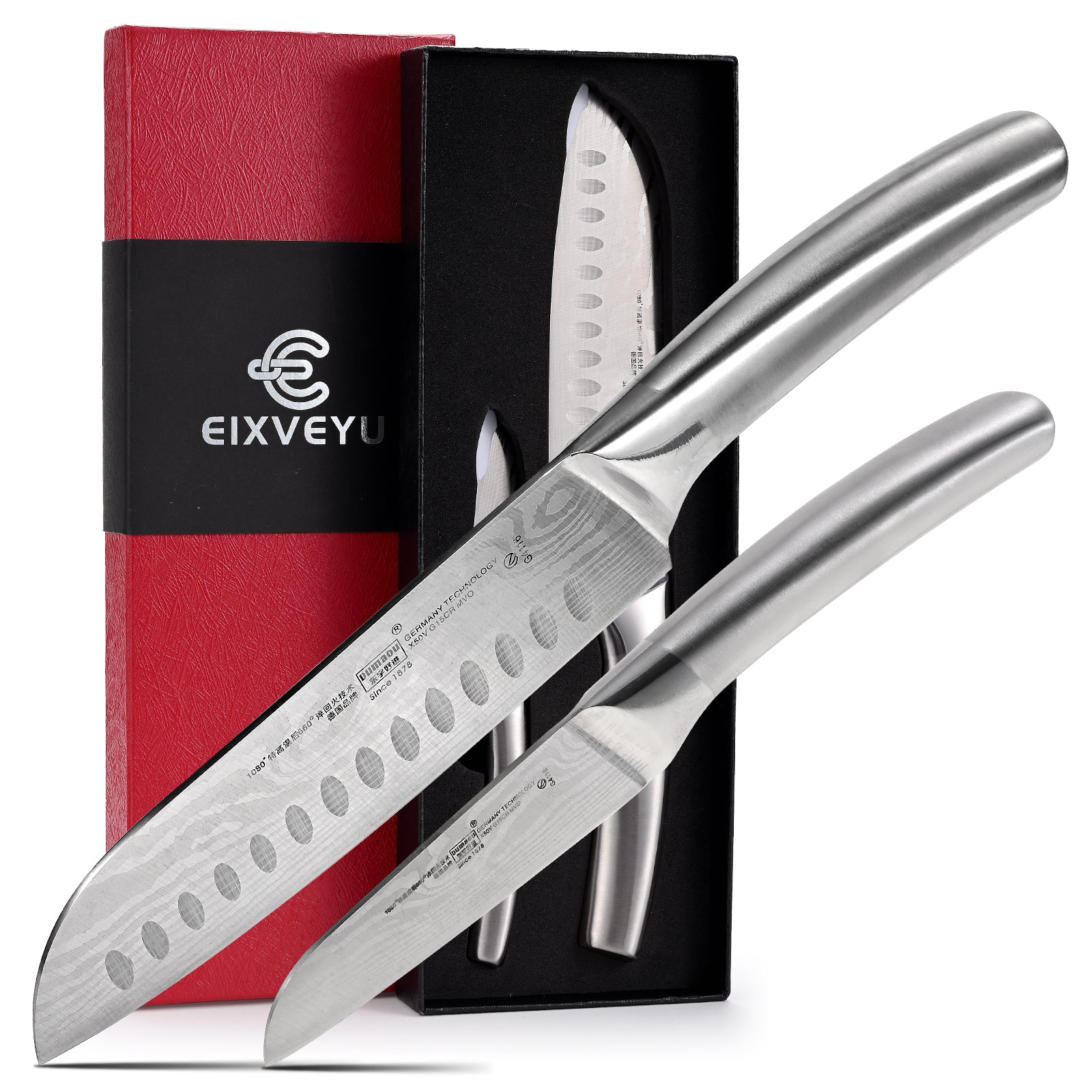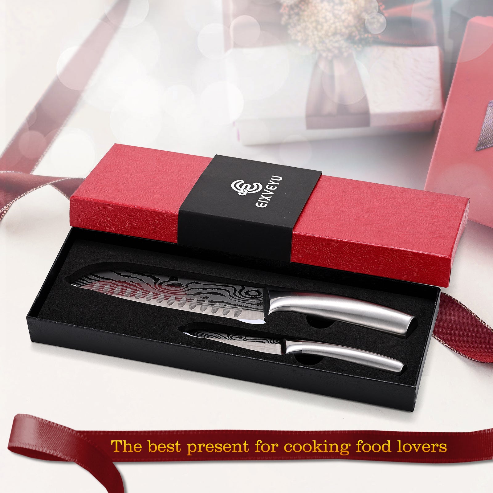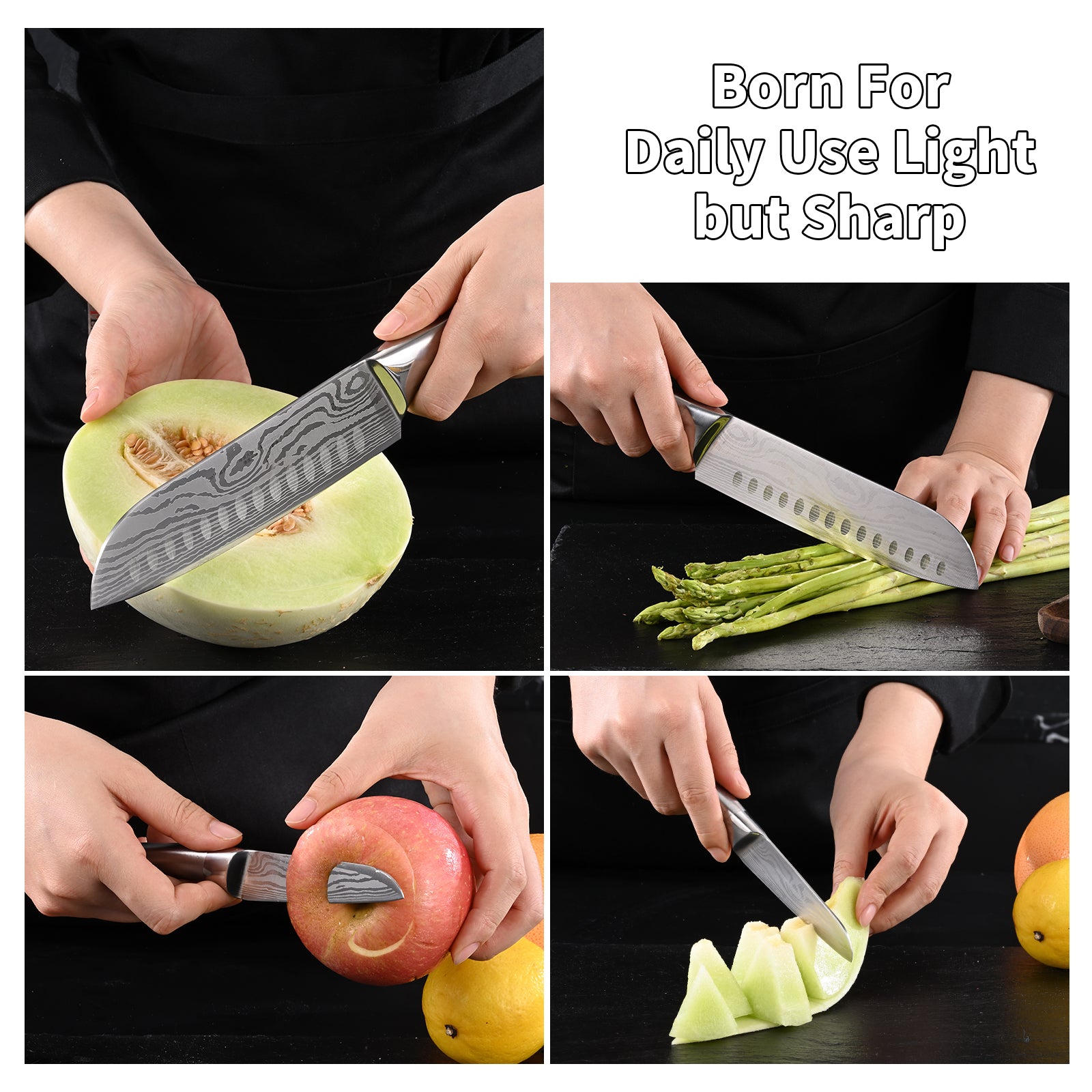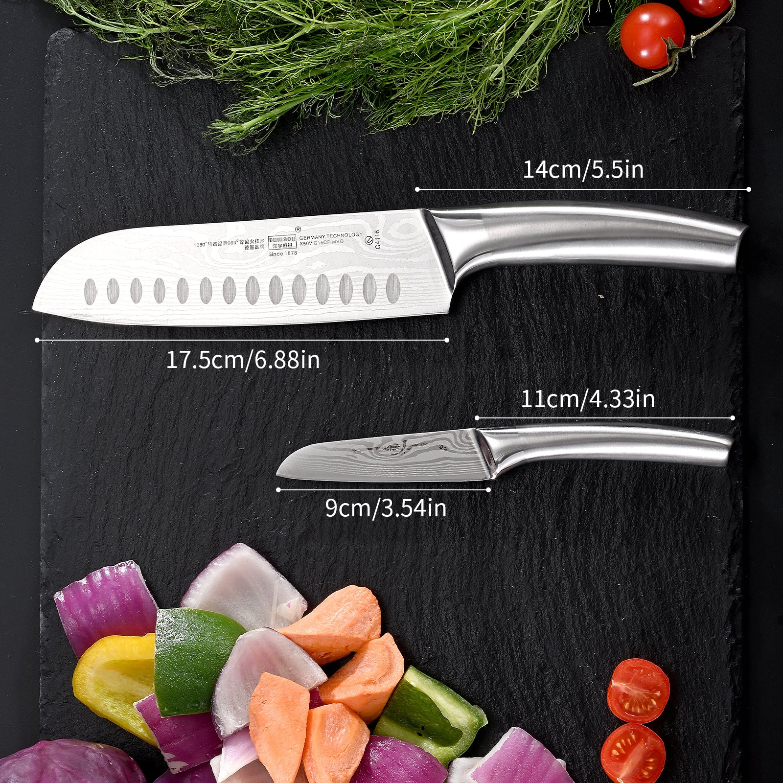 - 【Professional Knife Set】This kitchen knife set includes 2 razor-sharp knives: a 7 inches Santoku knife, a 5 inches fruit knife.Whether you're slicing meat,vegetables,dicing herbs,or prepping fruits, each kitchen knife of this set is designed to handle a variety of tasks effortlessly. Perfect for both professional chefs and home cooking enthusiasts.
