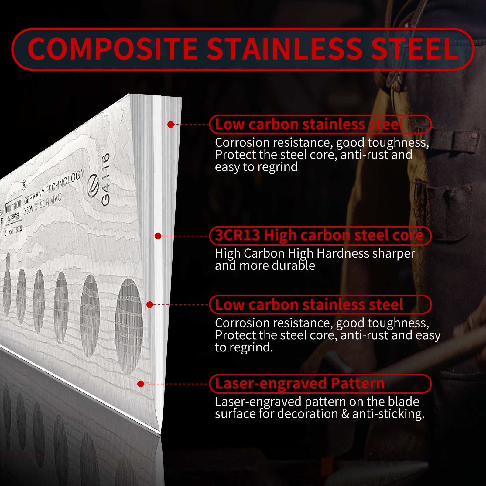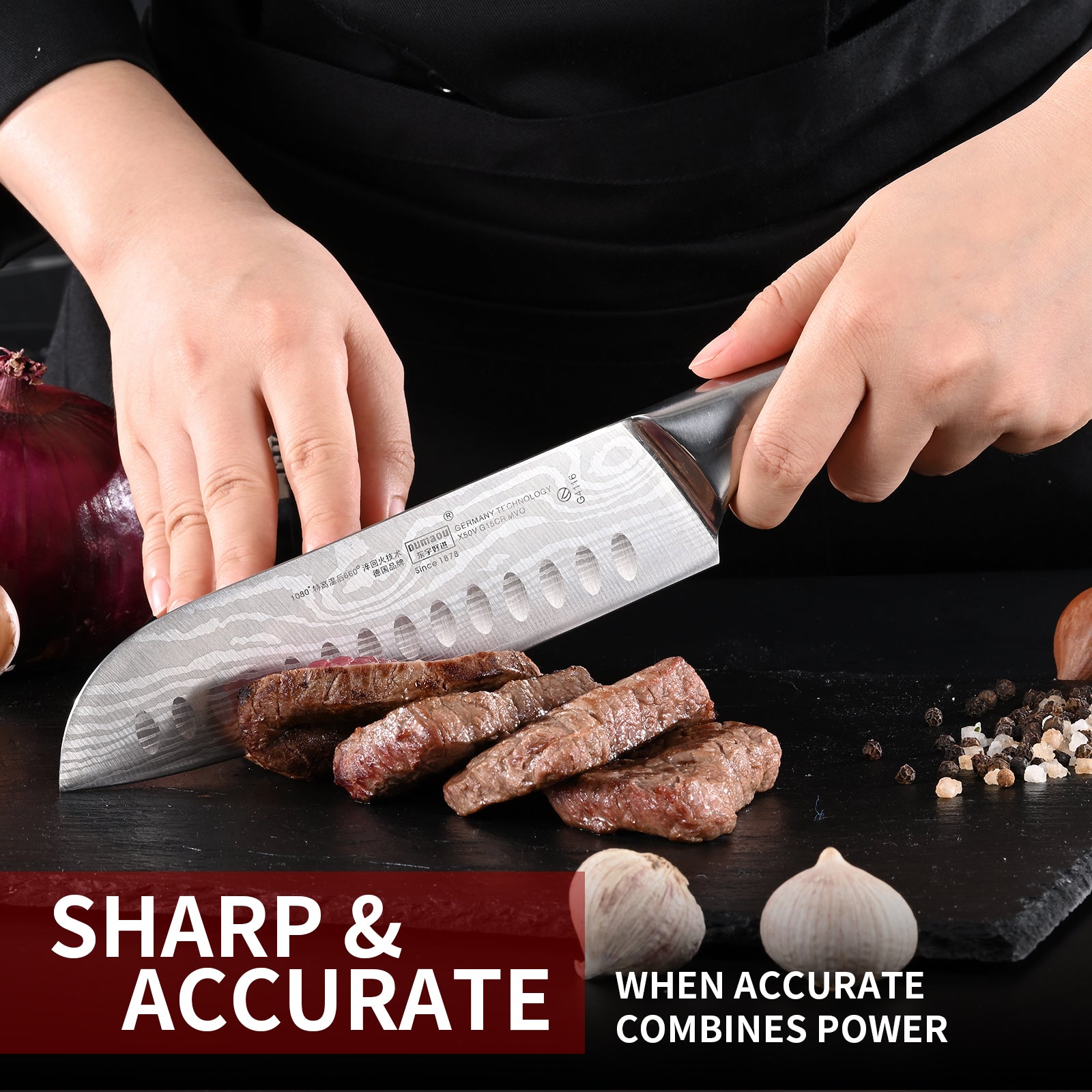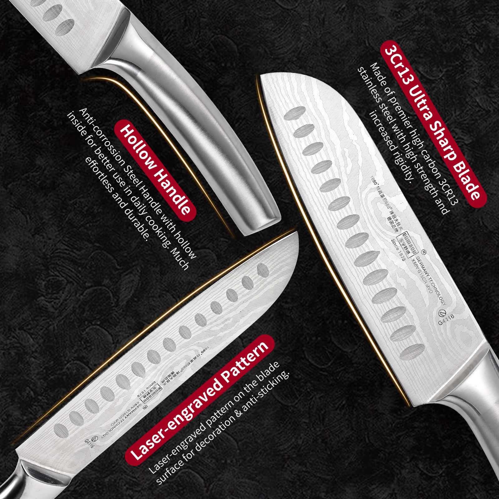 - 【Precise Craftsmanship】Each knife is hand polish producing a sleek blade and smooth grip with super sharp cut. Unique treatment creates long lasting sharpness.Laser-engraved pattern on the blade surface for decoration & anti-sticking.